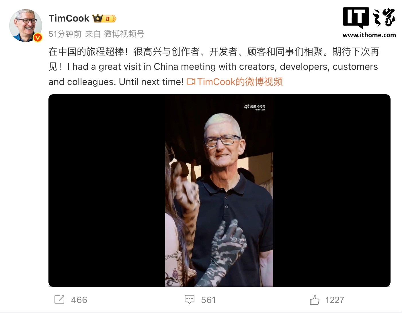 值得一提的是,库克今天午后在微博发文:“在中国的旅程超棒!很高兴与创作者、开发者、顾客和同事们相聚。期待下次再见!”